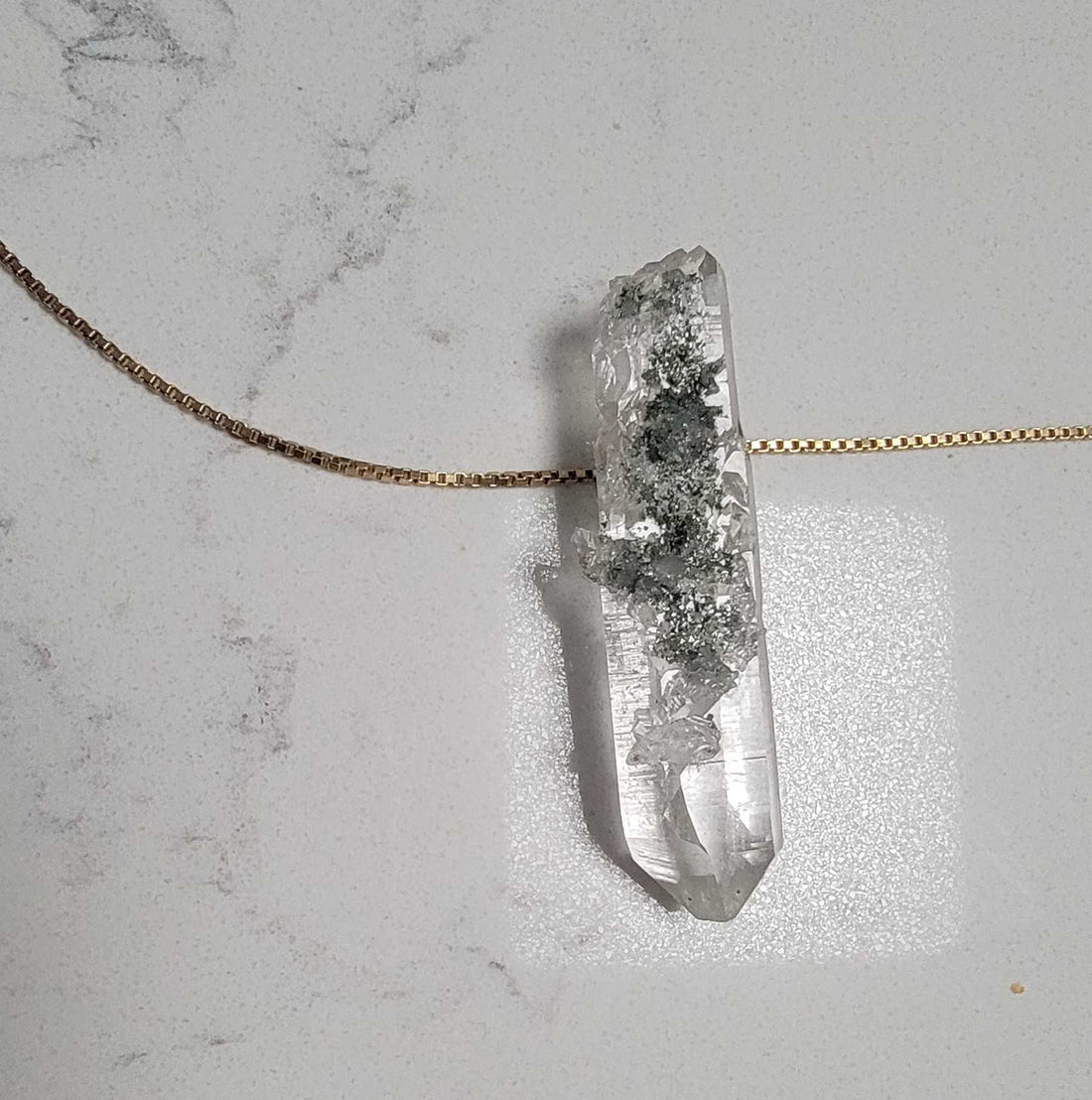 Elevate your elegance with this exquisite Chlorite in Quartz pendant, beautifully set on a 14k...