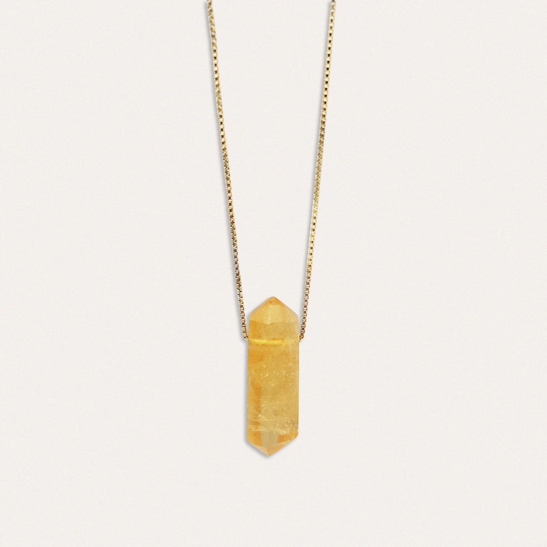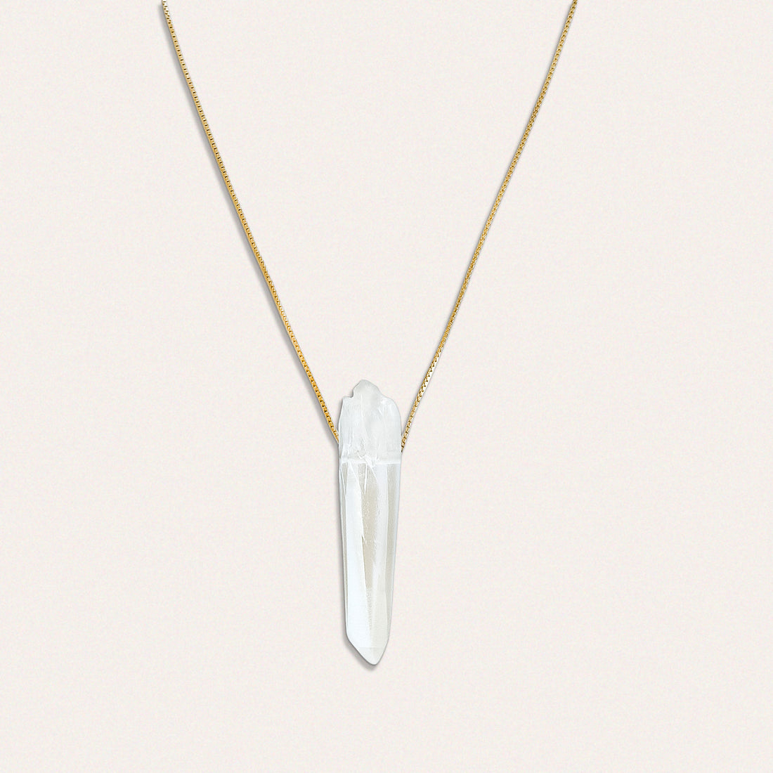 A polished clear quartz point paired with a fine box chain in solid 14k gold....