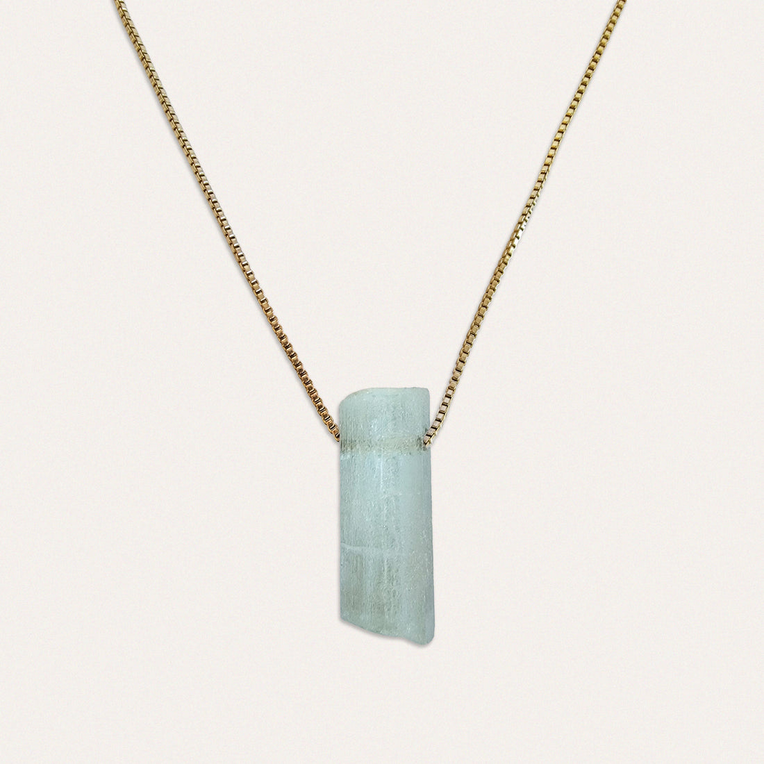 A raw aquamarine crystal pendant defined by its natural blue-green depth, suspended from a fine...