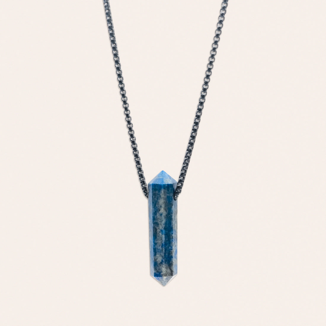 A polished double-terminated sodalite stone in a deep blue tone, suspended from a long titanium...