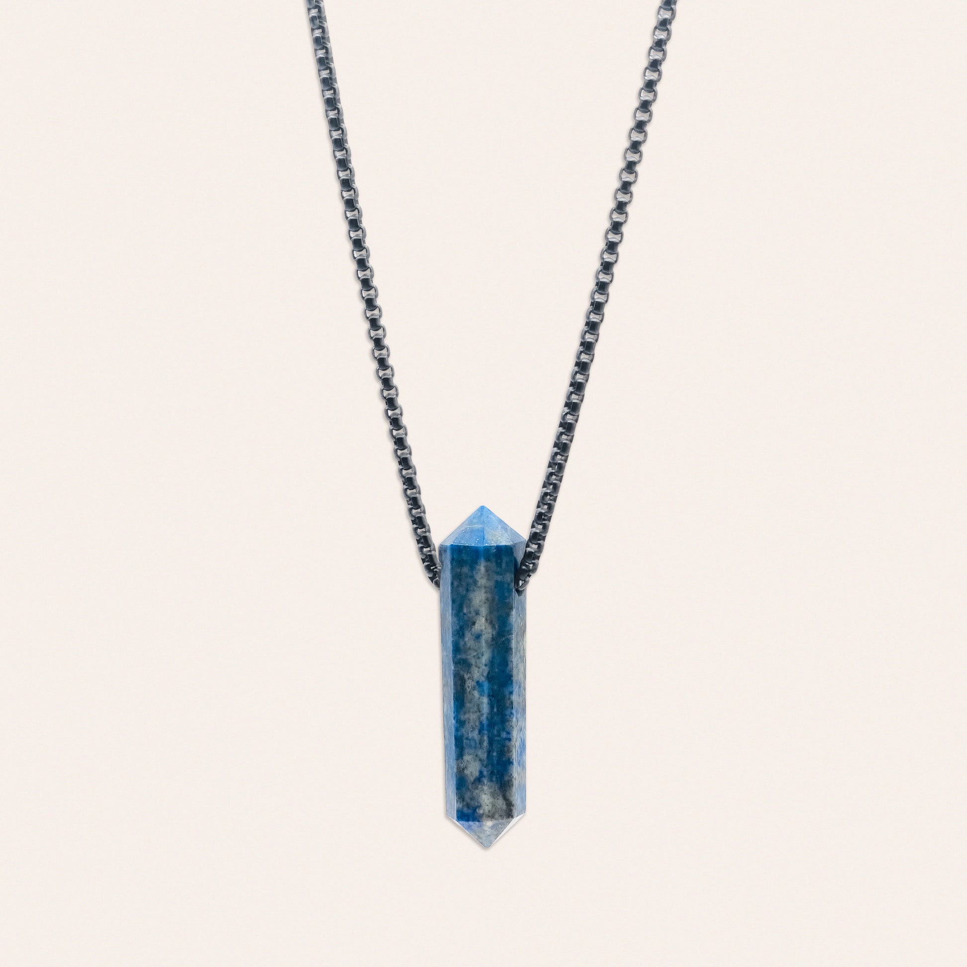 A polished double-terminated sodalite stone in a deep blue tone, suspended from a long titanium chain. Clean in form and graphic in presence, the design emphasizes contrast and proportion.